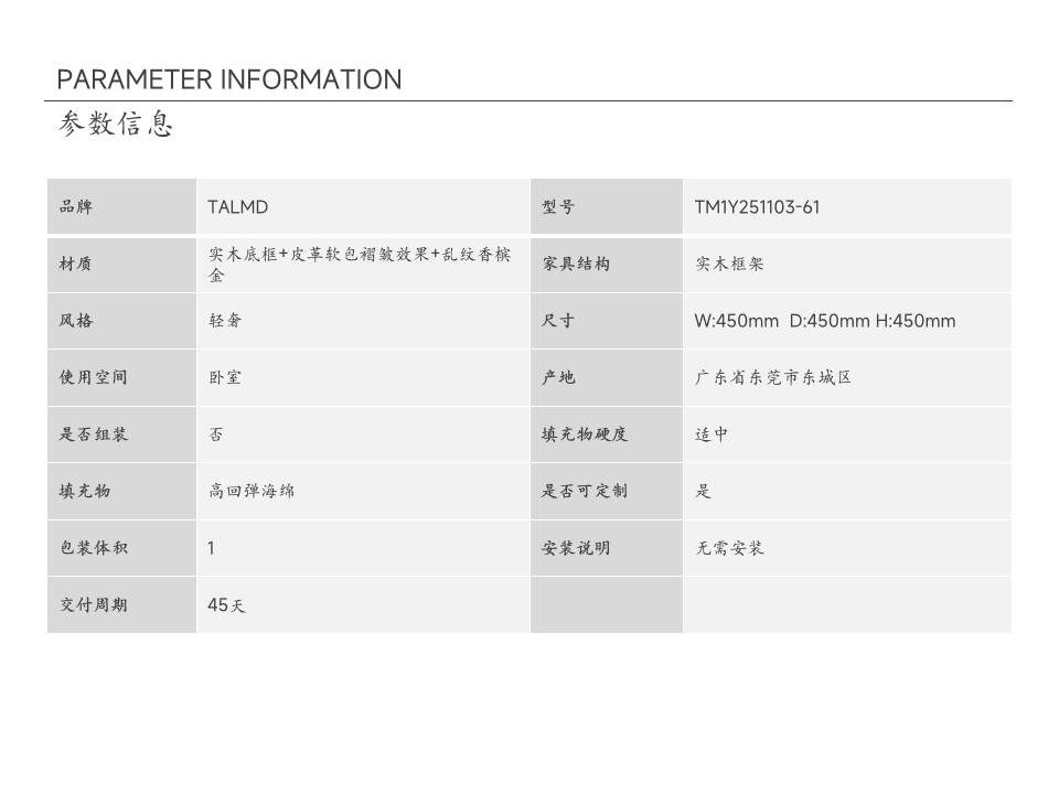 • 商品材质:实木底框+皮革软包褶皱效果+乱纹香槟金
