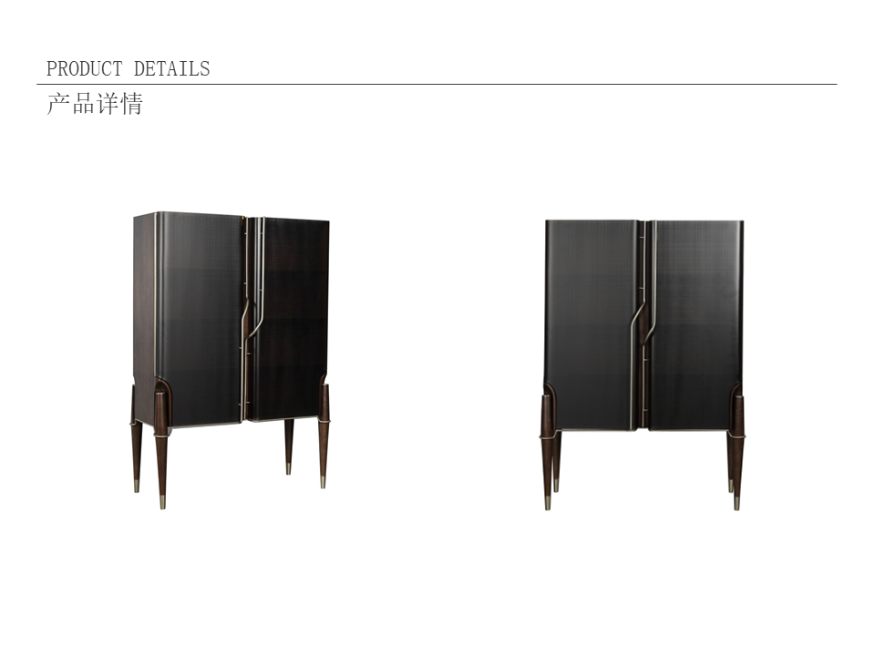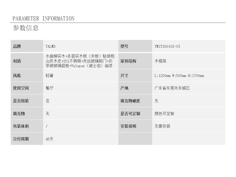 • 商品材质:水曲柳实木+多层实木板(夹板)贴胡桃山纹木皮+201不锈钢+夹丝玻璃柜门+灰茶玻玻璃层板+Valspar(威士伯)油漆