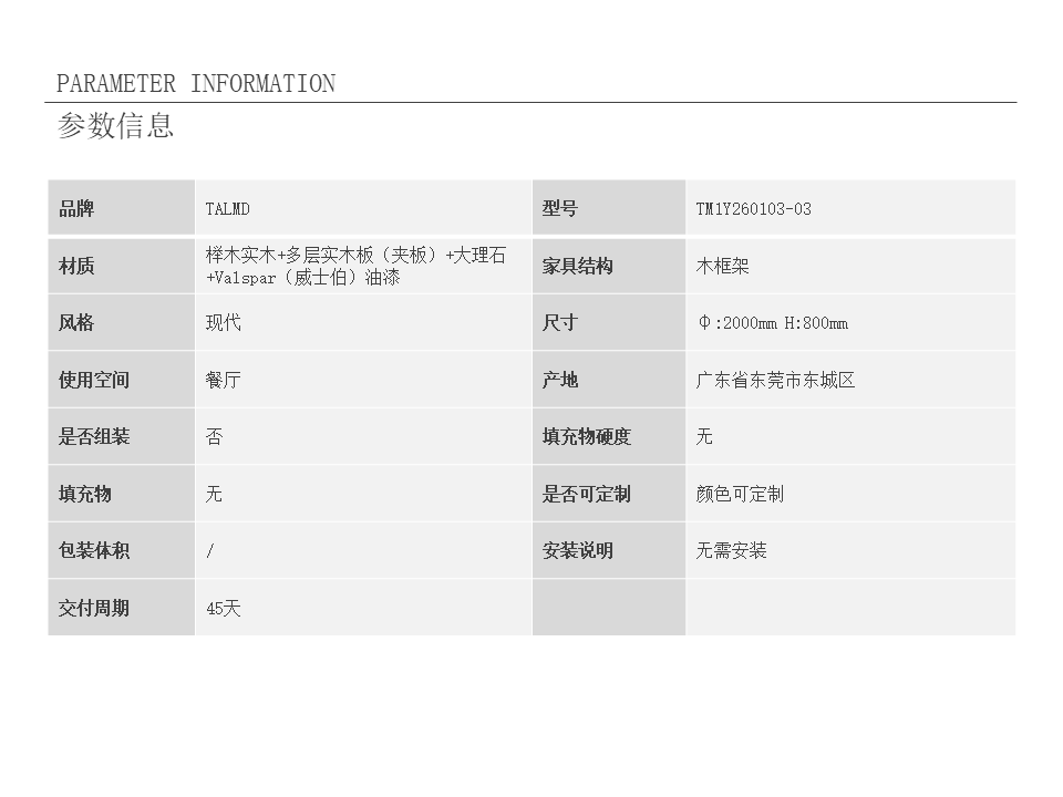 • 商品材质:榉木实木+多层实木板(夹板)+大理石+Valspar(威士伯)油漆