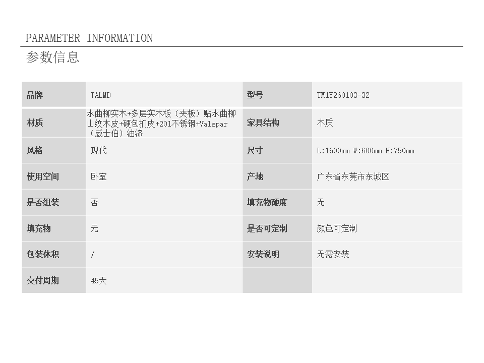 • 商品材质:水曲柳实木+多层实木板(夹板)贴水曲柳山纹木皮+硬包扪皮+201不锈钢+Valspar(威士伯)油漆