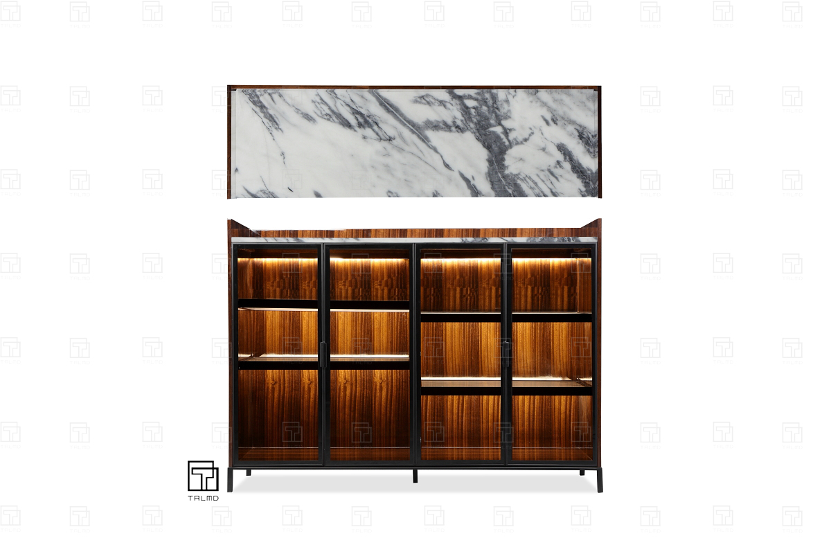 • 商品材质:欧洲榉木实木+多层实木板(夹板)或MDF中密度板贴澳大利亚烟熏尤加利木皮+夜来香大理石台面+201#拉丝香槟金不锈钢脚架+钢化玻璃+铝合金门框/层板框+LED灯带+顶高带阻尼滑轨+Valspar(威士伯)油漆