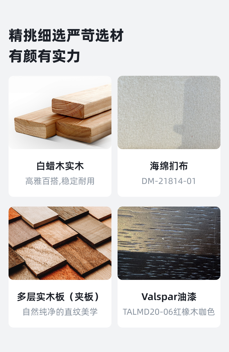 • 商品材质:白蜡木实木+多层实木板(夹板)贴红橡直纹木皮+海绵扪布+Valspar油漆