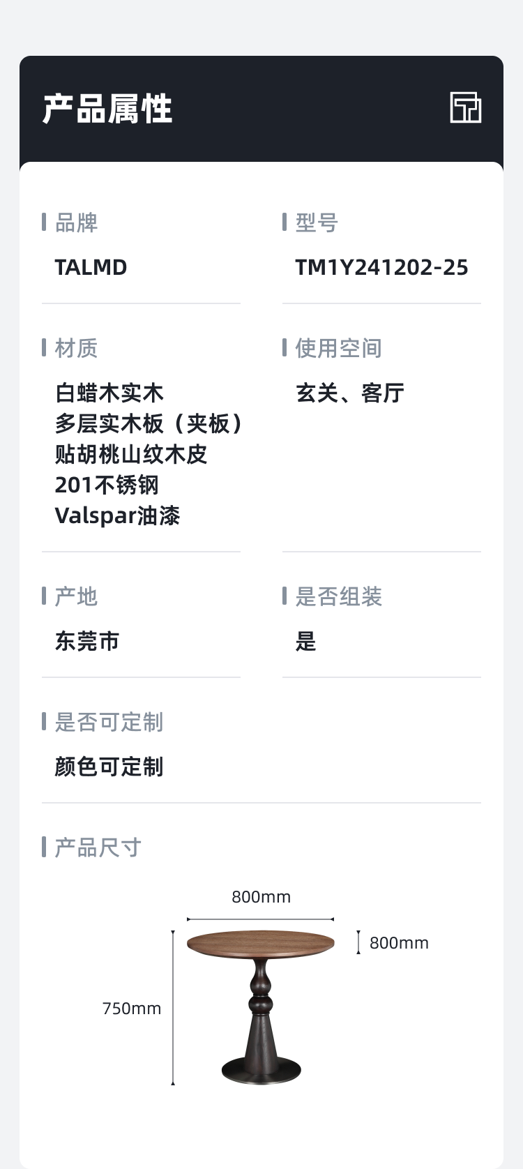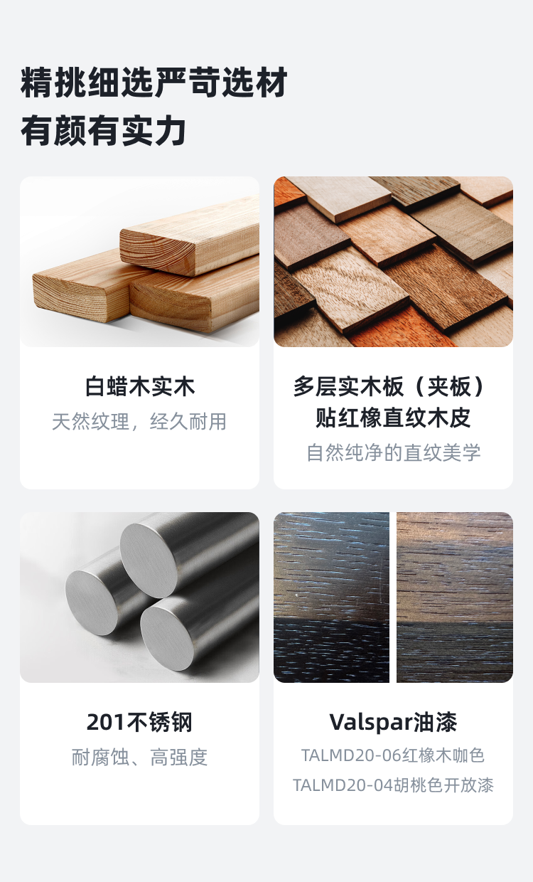 • 商品材质:白蜡木实木+多层实木板(夹板)贴胡桃山纹木皮+201不锈钢+Valspar油漆